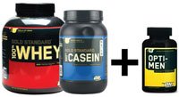 This kit includes one of each: Optimum Nutrition 100% Gold Standard Whey Protein Vanilla Ice Cream -- 5.15 lbs Whey protein isolates are 90% pure protein by weight. They are the purest and most expensive form of whey protein that exists. That's why they are the first ingredients you read on the 100% Natural Whey Gold Standard label. By using Whey Protein Isolates as our primary protein source, we're able to pack 24 grams of the purest, muscle-building protein per serving, with a lot less of the fat, cholesterol, lactose and other stuff that you can do without. What's more, 100% Natural Whey Gold Standard contains no artificial flavors, colors, or sweeteners. Optimum Nutrition 100% Casein Gold Standard Creamy Vanilla -- 2 lbs Rapid protein use is desirable immediately before and after exercise to help refuel recovering muscles, but delayed digestion and absorption may be more beneficial at other times -- including bedtime when your body typically goes for hours without food. Casein proteins are acid sensitive and thicken in the stomach. Because of this, it can take more than twice as long for Gold Standard 100% Casein to be broken down into its amino acid subcomponents than other proteins. By using only premium micellar casein, we've created a protein formula that's truly time-released. Optimum Nutrition Opti-Men -- 90 Tablets - YOU GET THIS FREE! AN .99 VALUE! Opti-Men is a complete Nutrient Opt